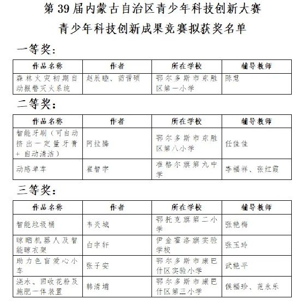 近日,第39届内蒙古自治区青少年科技创新大赛获奖结果公示结束。鄂尔多斯市共审核推送19项参赛作品,最终有13项作品脱颖而出,荣获佳绩。其中,一等奖2项、二等奖3项、三等奖8项。