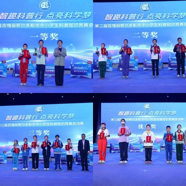 经过激烈角逐,赛事最终评选出团体奖与个人奖两大类别奖项。在团体奖中,小学组、中学组分别诞生一等奖1支、二等奖2支、三等奖3支及优秀奖3支;个人奖方面,评选出“科普演讲达人”“最佳选手”8名。同时,东胜区科学技术协会、达拉特旗教育体育局等8家单位获“优秀组织奖”,杭锦旗实验小学李旭冬、鄂托克前旗第一中学好日娃等18位教师获“优秀指导教师奖”。